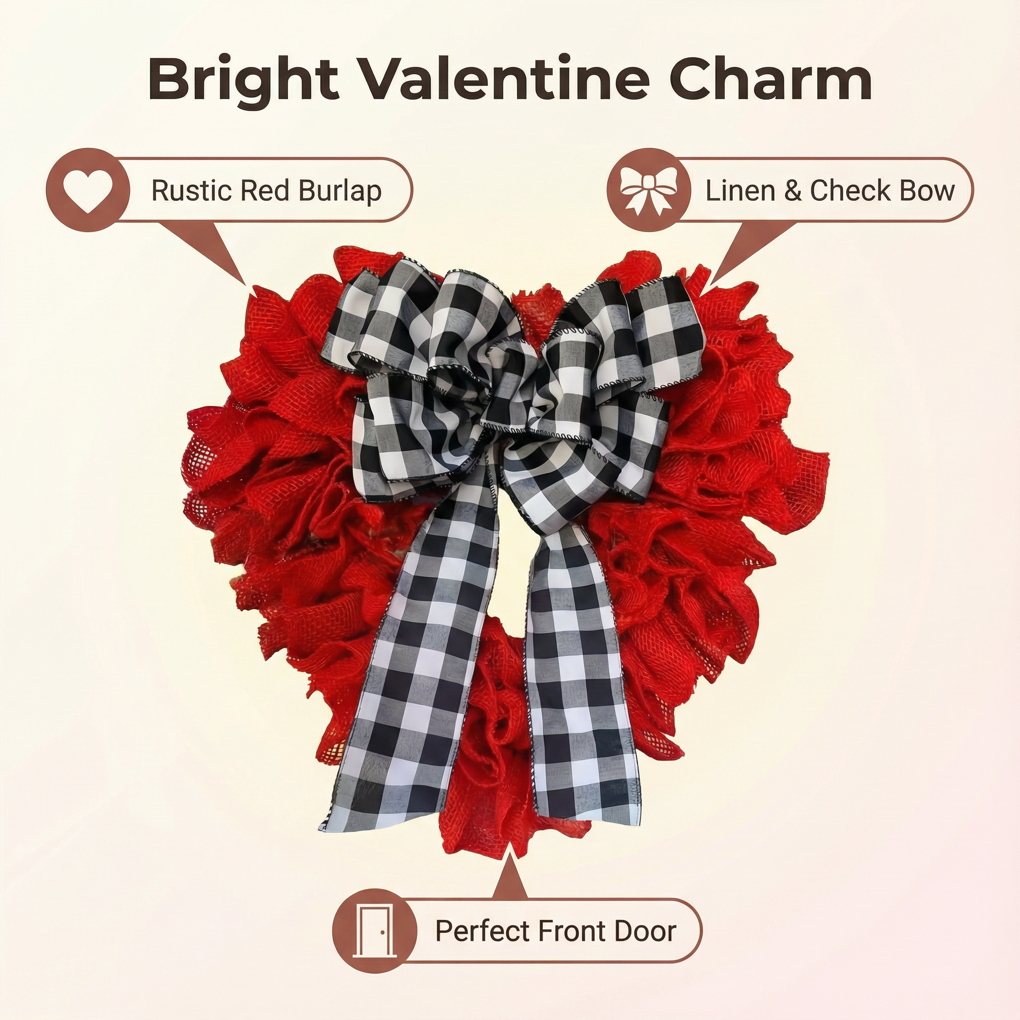 Designed in a full, layered heart shape, it features rich red burlap ruffles paired with a classic black-and-white check bow—rustic yet charming, simple yet full of love. Whether welcoming guests at your front door or adding seasonal warmth indoors, this wreath makes Valentine’s Day feel instantly special.